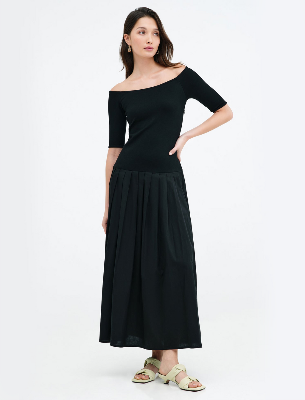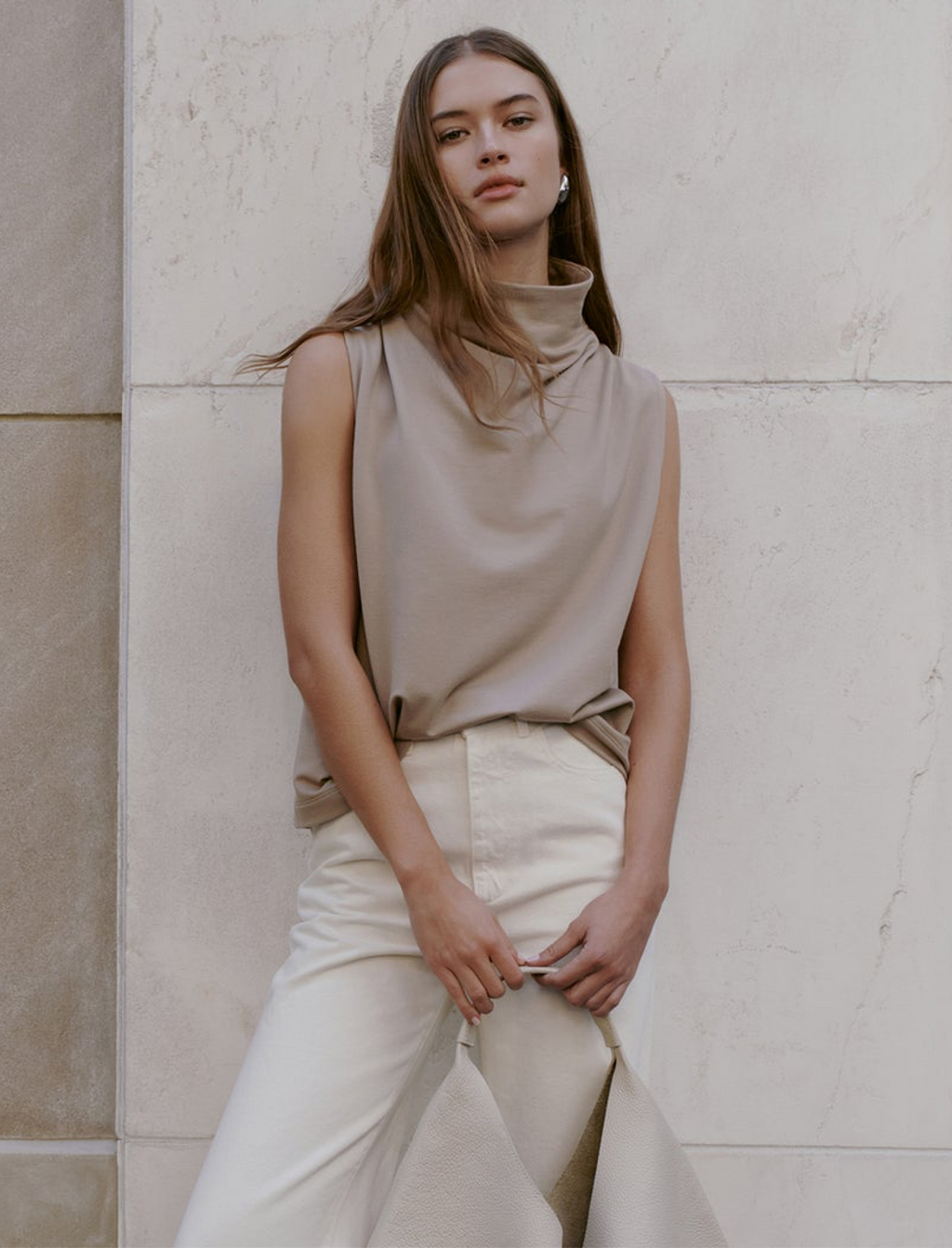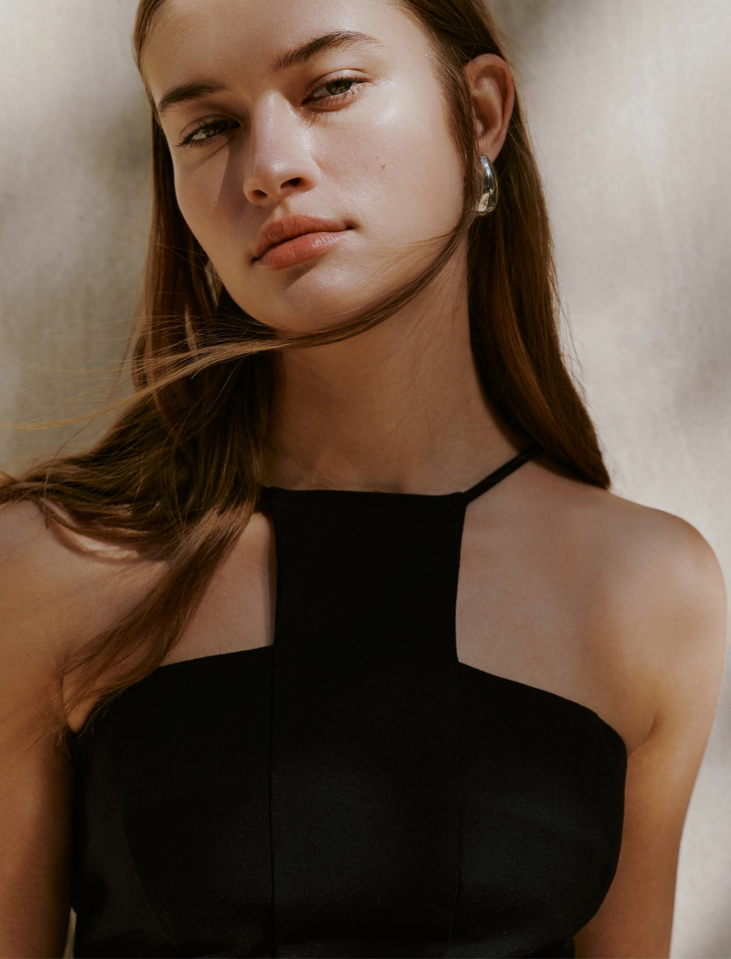 “Reminds me of a dress I had in my 20’s, but with great fabric, comfortable lining, and still with stretch. The structure of the design stays but it comfortably wraps around under the arms. Love it. Effortless with an edge.”