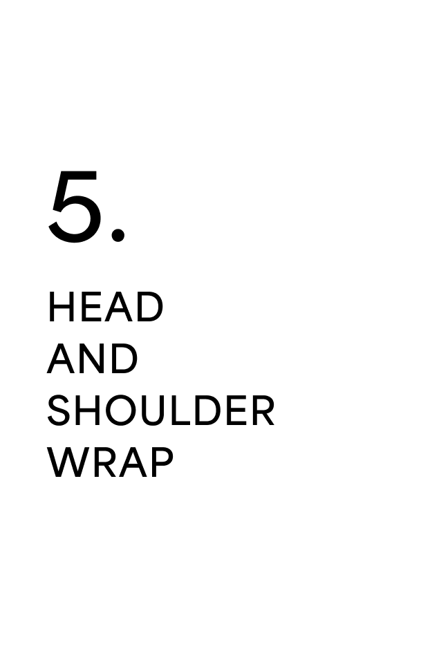 Start with the scarf around your neck and simply adjust the fabric so that it rests evenly upon each shoulder, covering your upper arms and falling flat against your upper back.