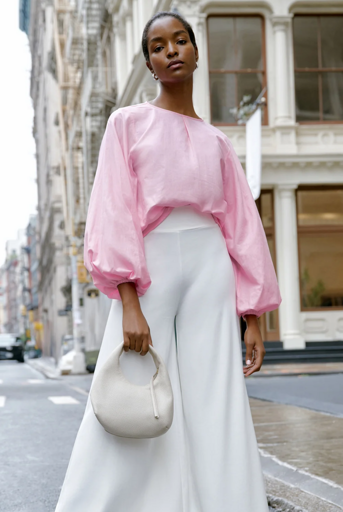 Our Ezra Top embodies London’s aesthetic blend of classic and contemporary, refined and edgy. She features all the characteristics of a classic button-up—a crisp collar, clean tailoring, polished mother-of-pearl button cuffs—only enlivened by modern details like a cropped back and diagonal seam detailing.
