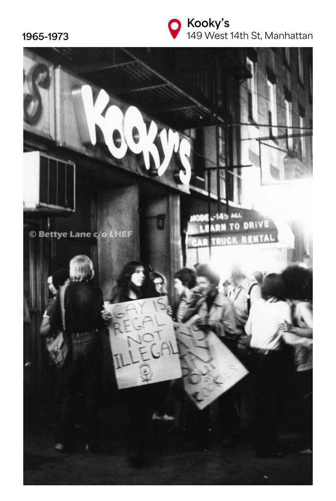 Kooky’s Cocktail Lounge was another site of activism that emerged after the Stonewall Uprising. Since the end of prohibition in 1933, many gay bars were run by members of the mafia - resulting in often oppressive environments with unfair management practices. Lesbian patrons within the Gay Liberation Front were inspired by the actions at Stonewall and organized against the management and existing conditions of Kooky’s.