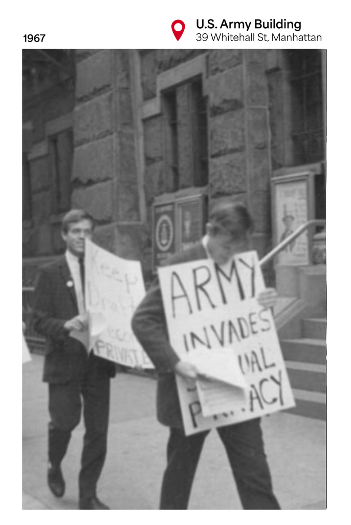 In 1967, the first-ever public demonstration for LGBTQIA+ rights occurred. Organized in front of the U.S. Army Building in Lower Manhattan, it was led by the Homosexual League of New York (HLNY) and the New York City League for Sexual Freedom (LSF), two organizations that disagreed with the military’s unfair rejection of gay people and, additionally, the military's practice of sending gay men’s draft records to employers without consent. The protest received little to no response from the media at the time but it inspired more confidence going forward in the practice of picketing demonstrations for LGBTQIA+ rights.