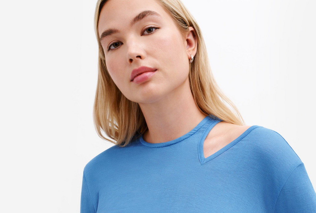 Blue pairs well with metallic accessories. Our Hester Cutout Top, with a bag or shoes in silver or disco, creates an electric look that will positively charge any room