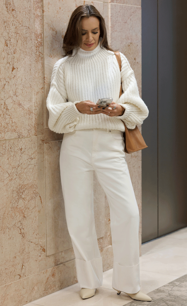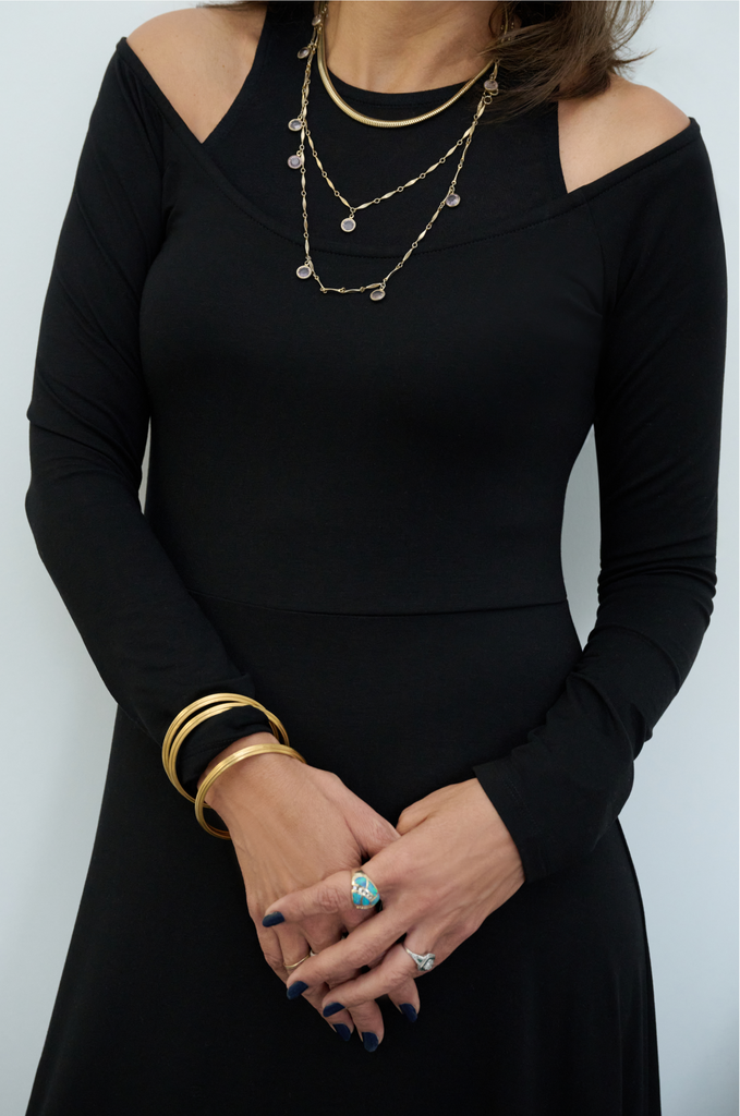 Оne of the reasons I've enjoyed doing this collaboration with Marcella is that I love clothes and I have to say that I celebrate my mom and my grandmothers through it because they love clothes. I have absolutely inherited that fashion passion. And as we get into the winter and things get a little chilly outside, I love the Brenda Sweater because I can put it on and I could feel cozy and warm at home, but then I could also look fabulous outside because it's bulky and fun and accessible. I also love the Diana Coat. If you haven't had a chance to try that on, it is amazing. And again, you could pair it up with jeans and with the Brenda sweater underneath. Or you could use a nice black dress like I did in the shoot and spice it up. So I love the flexibility of both. But at the end of the day, if you ask me where my happy place is, it's always being comfy. And, boy, do the Brenda Sweater and the Diana Coat deliver.