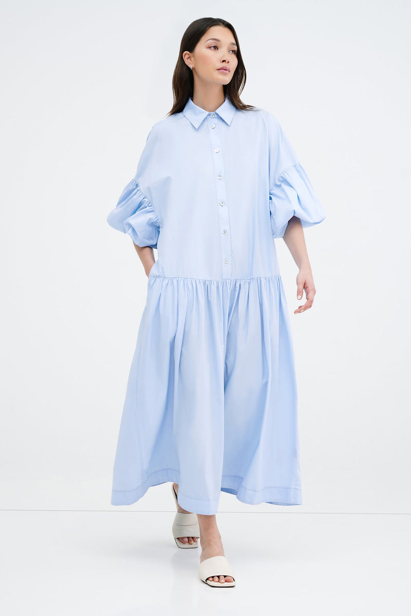 Meet our Ada Dress, the ultimate warm weather staple. She's a midi shirtdress handcrafted from 100% European poplin cotton, featuring pockets and a dropped gathered waistline that falls over your frame with ease. Her clean lines and sharp collar harmonize with dramatic dropped shoulders and full-bodied sleeves, elevating your style for any occasion.